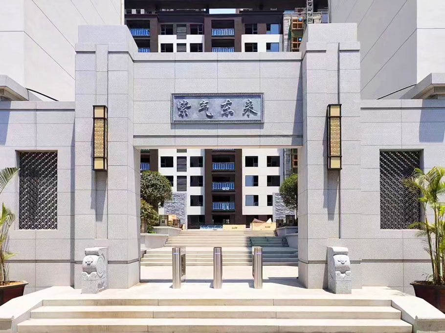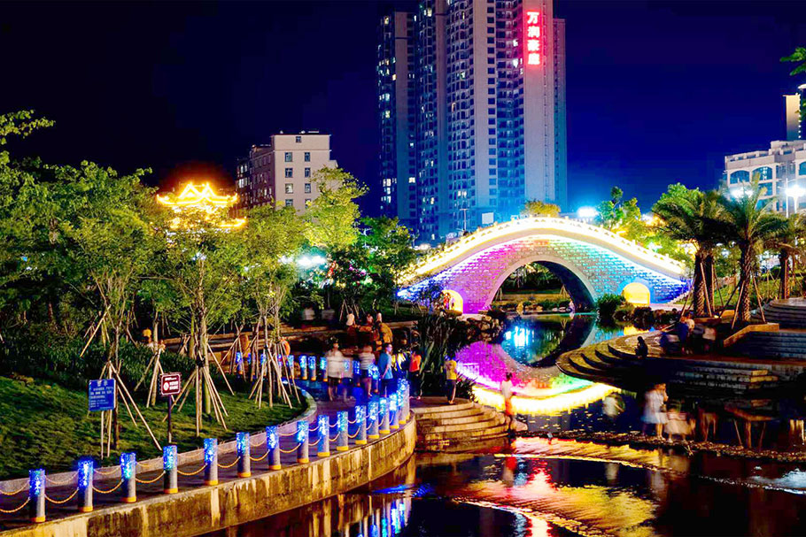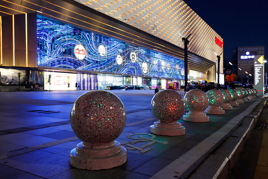新型路障石材具有擋車功能,提升場所的形象和安全性,夜晚展現出特別絢麗的效果